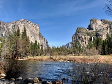 Once reaching the valley, the first stops are along the south wall of the valley: Bridalveil Falls and Tunnel View. From these stops, there are views of the falls, other west valley falls, and the massive rock structures of El Capitan and the Cathedral complex. Photos here