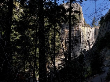 After breakfast, I took the Valley shuttle to Happy Valley and hiked toward Vernal Falls on the Mist Trail. Being early, the trail was uncrowded. It had been cold the night before and bridge over the Merced River below the falls was slippery with black ice. After stabilizing myself and taking a few pictures, I ontiued up the trail toward the falls. About 1/3 mile beyond the bridge, a view of the falls emerged from beyond a cliff. I took a few photos and then retraced my path to the bottom. I shuttled to the Camp Curry (now Half Dome Village) area where I spied a coyote and shot some photos of Half Dome. Pictures here.