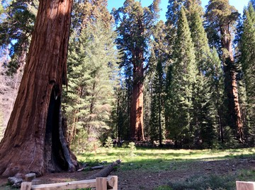 By Tuesday, I apparently had acclimated to the altitude and set out to hike through the Giant Forest from the General Sherman Tree to the Museum. I rode a park bus from the parking lot for the Sherman Tree to a shuttle stop near the tree, avoiding a walk down many stirs (hard on my knees). After visiting the largest currently living tree, I started down the Congress Trail toward the Senate and House groups of trees, paying my respects to The President and Chief Sequoyah along the way. After passing the House and seeing McKinley, I turned down the Alta Trail. Passing Lincoln, I took a short spur to the remains of Washington and then came to the break in forest at the Bedrock Mortors. After traversing the rockier terrain, I entered a mixed forestwhile traversing a slope above Deer Creek. Finally, I hit the junction with the Big Trees trail, and after eating my packed lunch, heade across the Highway to Round Meadow, site of the ranger walk and bear sighting last year. Paying my regards to Ed (by Ned), I passed Clara Barton on my way to the shuttle stop.